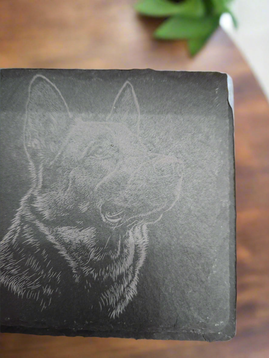 Add a touch of charm to your coffee table with these slate coasters featuring adorable dog engravings. Each coaster is paired with a handmade wooden holder, blending rustic style with playful personality. Perfect for dog lovers who want to protect surfaces while showcasing their furry friends in a fun, unique way.